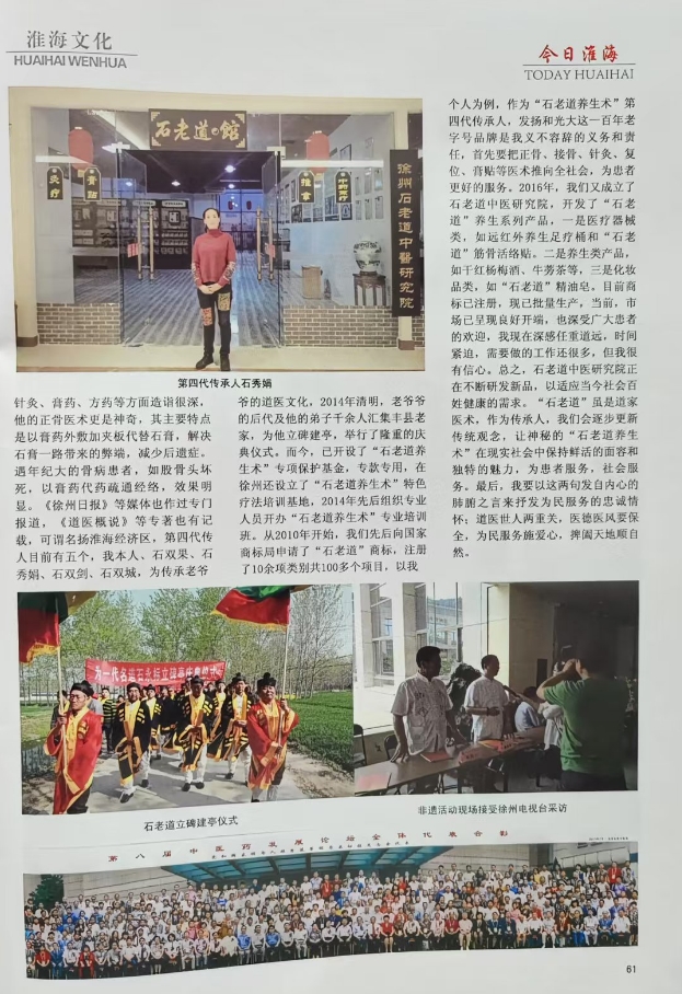 ★2016年11月“今日淮海”之淮海经济区非物质文化遗产专栏,以“华夏沃土有道医,非遗传承有后人--访非遗传人郭爱军”为题,报道了石老道养生术的核心技艺和传承有序。